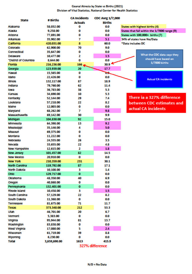 Yet the data is incredibly inaccurate, as the attached CDC data sheet reflects an unimaginable distortion of data. Of the 50 US states, which 34% do not provide any data on CA whatsoever, California has the most births 420,031 annually, yet has only 8 incidents of choanal atresia. Florida has 216,236 births and 166 incidents of CA, while New York with 210,359 births has 231 incidents, and Texas, 373,340 births has 212 incidents of choanal atresia incidents; these are 2021 data figures published by the CDC. Furthermore, California which leads the nation in number of births annually list 8 incidences yet Arkansas, which ranks 40th in number of births, has 12 incidences. A deeper analysis of the data reveals that the 1/5000-1/8000 occurrence data is completely inaccurate. Based on the commonly accepted incidents rate by the CDC of 1/7000 births, there is a 327% disconnect in the figures between CDC estimates and actual recorded incidents, see attached chart. In most cases that number is more than triple the CDC data. There may be a far greater number of infants who are not diagnosed at birth who may not be part of this statistic.